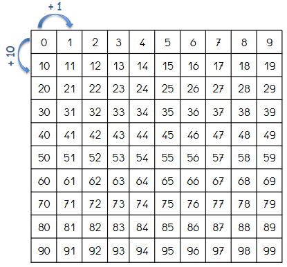 Se servir d’un tableau des nombres : Le tableau des nombres de 0 à 99 aide à mieux comprendre la logique de l’écriture des nombres en faisant apparaître en ligne ou en colonnes, des « familles » de nombre : les nombres à un seul chiffre, ceux qui se terminent par 0, ceux qui commencent par 3, etc.