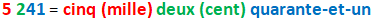 5241 => « 5 » est de la famille de « mille » : on dit « 5 mille » ; « 2 » est de la famille de « cent », on dit « 2 cent » et on lit les deux derniers chiffres normalement « quarante-et-un ».